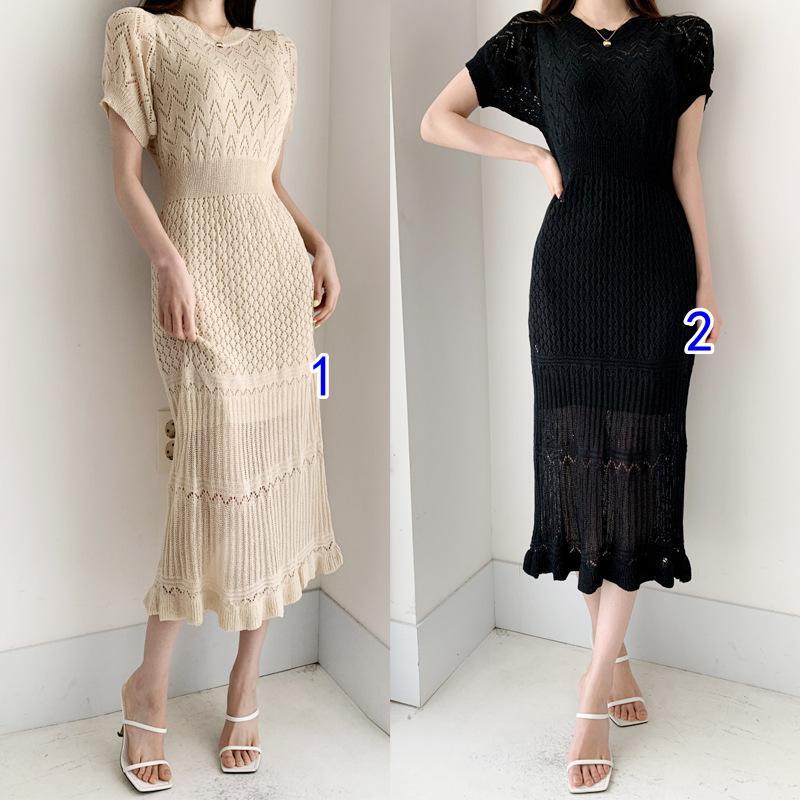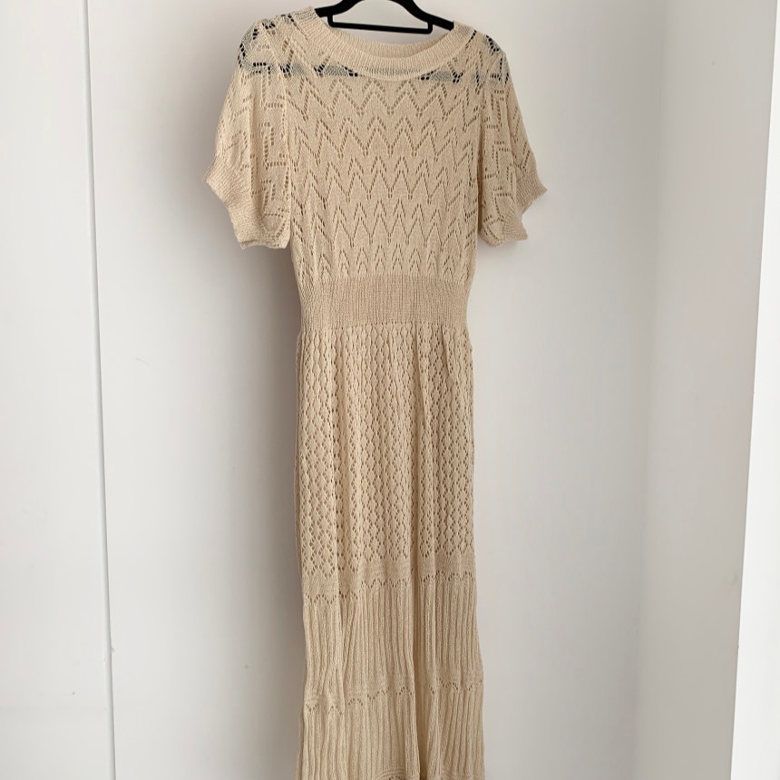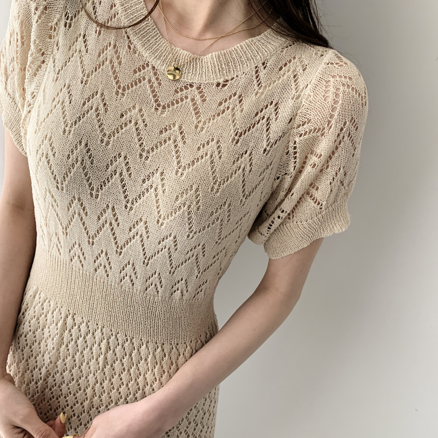 美しい透かし編み模様が魅力的なニットワンピースです。 体のラインを綺麗に見せるタイトなシルエットで、女性らしさを演出します。 ベージュとブラックの2色展開で、様々なシーンに合わせてお選びいただけます。